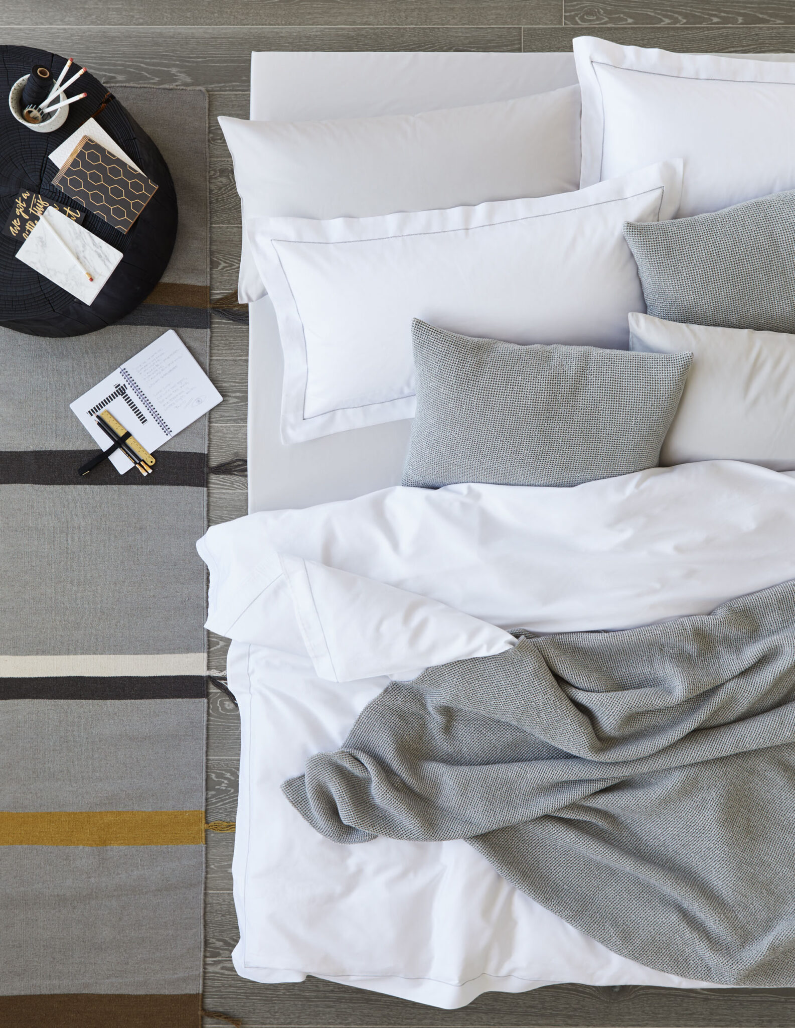 - Bettwäsche kommt ohne Dekoration am Bild wie Zierkissen mit Streifen oder Tagesdecke