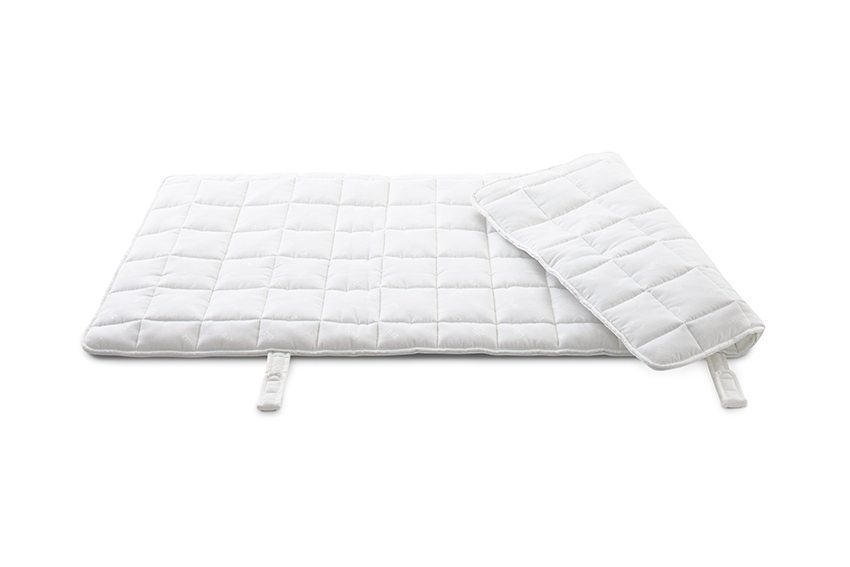 Der Topper T1 ist eine sehr leichte Auflage aus LUIZ-Drell mit Schurwolle und Kaschmir versteppt. Die Anfangsweiche und Feuchtigkeitsaufnahme sorgen für gutes Schlafklima. Im Doppelbett verbindet er zwei Einzelmatratzen zur durchgehenden Liegefläche und wird mit vier Befestigungslaschen fixiert.